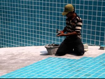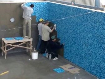 По -добре е мозаечната облицовка да започне 5 дни след приключване на хидроизолационните и шпакловъчните работи. Плочка или мрежа с мозаечни квадратчета се полагат върху специално лепило. Декорацията започва от стените под формата на хоризонтални редове. Ако в дизайна на купата или дъното на басейна има определен модел, панел или симетричен орнамент, тогава си струва да започнете да полагате от средата на реда.