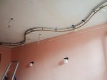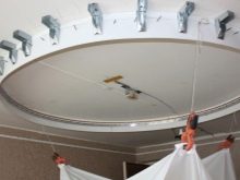 Платове за тавани на две нива е най-добре да се поръчат незабавно от производителя с необходимия размер и форма. Така че по -късно у дома да не се налага сами да изрязвате или подрязвате ненужни. По -добре е да се измерва с рулетка и молив, които ще маркират измерените области. Много е важно веднага да се предвиди височината на първия праг на тавана, най -близо до бетонната плоча, за да можете безболезнено да поставите осветителните тела и да ги извадите. Не трябва да се забравя, че някои прожектори се нагряват много по време на работа, което може да повлияе плачевно върху целостта на мембраната..