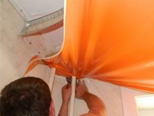 Сглобяването на опънат таван със собствените си ръце вече не изглежда толкова страшно, ако сте сигурни в направените измервания и директно в производителя на платна за новото покритие. За да разтегнете правилно PVC фолиото, трябва постоянно да поддържате температурата в помещението най -малко 30 градуса. В никакъв случай не се препоръчва да отваряте прозорци, да създавате течение или да издухате третираната стая..