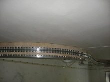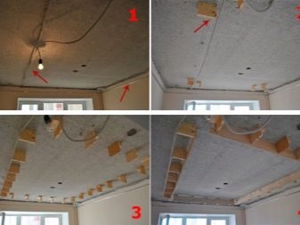 Нека се спрем на шперплатовите фурнирни ленти. Тяхната дължина ще зависи изцяло от размера на неравномерния участък на долното ниво на тавана. Ширината му е посочена условно, избрана като се вземе предвид инсталирането на лампи и плоска домашна повърхност.Така че лента от шперплат е прикрепена към дървени блокове с помощта на самонарезни винтове. Рамката за нивото на навиване на опънатия таван е готова. Връщаме се към маркировките, опънати по периметъра на стаята. Тук ще бъдат инсталирани багети за първото и второто ниво на платна.