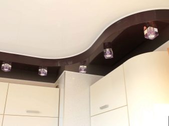 - Много печеливш вариант е комбинация от матови и лъскави повърхности. Този дизайн играе със специални цветове, тъй като матово бежово фолио е концентрирано в центъра на тавана, рамкирано от второ ниво на тъмно кафяво с подсветка на прожектори.
