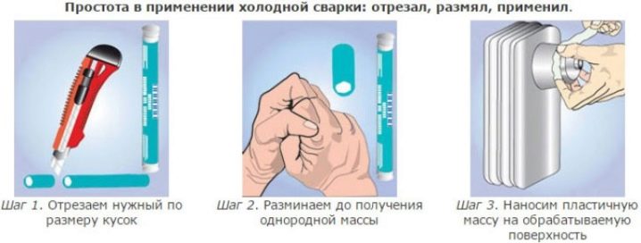 Използването на “студено заваряване” става възможно за продукти, изработени от алуминий, чугун, мед и други опции. Те го използват активно в процеса на премахване на проблемите с водопроводното оборудване и отоплителните тръби. Не винаги е удобно батериите да използват опция за горещо заваряване и правилно подбраното лепило, нанесено по правилния начин, може напълно да го замени. В допълнение, съставът успешно се справя с ремонта на метални контейнери и радиатори за автомобили, поради което по този въпрос приложението му е особено добре дошло.