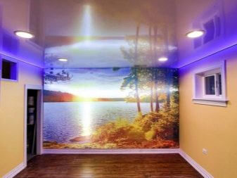 - Ако дизайнът е избран за коридора или коридора, обърнете внимание на матовия печат на снимки с изображението на небето, допълнете го с вътрешно осветление и гъвкав контур по периметъра.