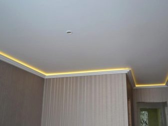 Лаконичните дизайни на едно ниво не предвиждат създаването на кутия от гипсокартон. В този случай релефът се формира с помощта на елементи, които носят декоративен товар. Те включват формоване, формоване, тавански цокъл, имитация на гипсова мазилка. Към тях обикновено се прикрепя подсветката, поради което в този случай по -често се използва гъвкава лента..