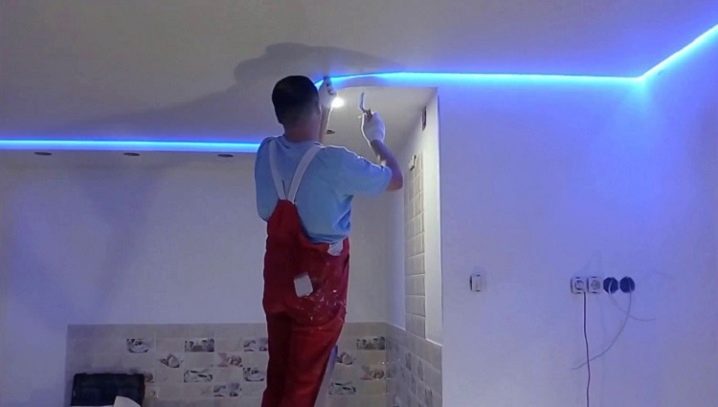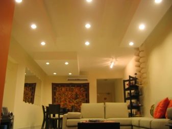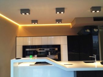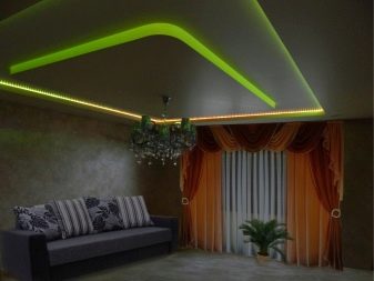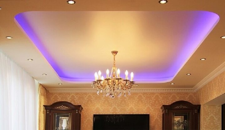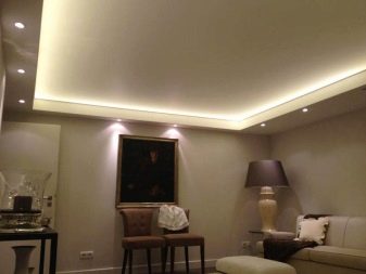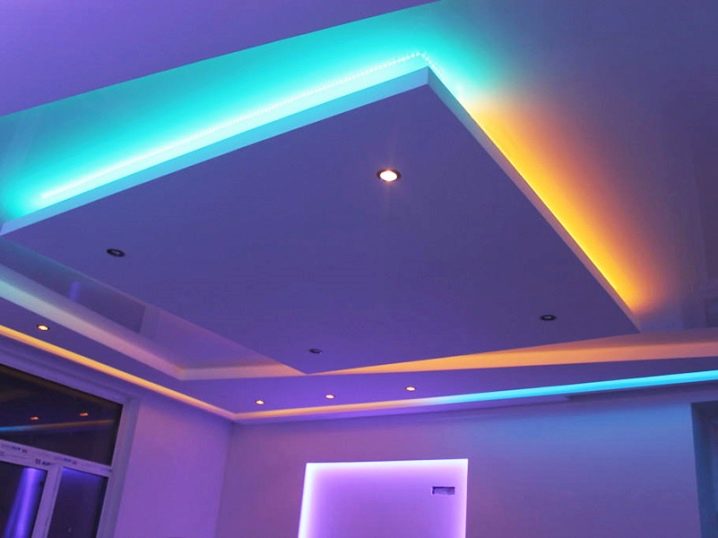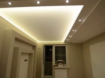Понякога по периметъра на кутията за гипсокартон дизайнът предвижда прожектори, които могат да се включват отделно от общия състав.