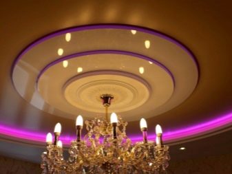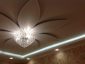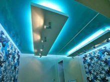 Много коментари се присъждат на решения, използващи конструкции от гипсокартон. Интересно изглеждат опънати платна, допълнени от различни къдрави елементи, ако всяко ниво е подчертано с гъвкаво осветление или прозрачен светещ кабел.