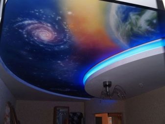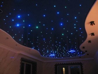 Най -популярните отпечатъци са небесни и космически теми.. Темата за космоса и звездното небе е перфектно въплътена благодарение на вграденото осветление под формата на панделка и снопове оптични влакна.