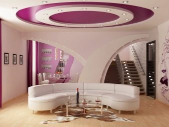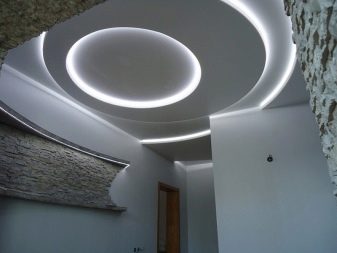 Най -интересното решение е техниката на зониране, което ви позволява да подчертаете отделни участъци от тавана, създадени от различни конструкции, изработени от гипсокартон.