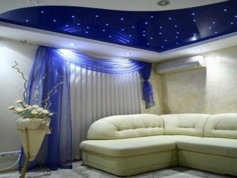 - В състава на опънат таван можете да използвате няколко вида осветление едновременно (например полилей, прожектори, лента, нишки от оптични влакна). Тази техника ви позволява да промените възприятието за таванското пространство, изтривайки границите на тавана, изпълвайки стаята с въздух и лекота..
