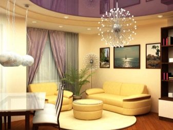 Същото се отнася и за сортовете огледален тип с лъскава текстура: те отразяват на повърхността всичко, което се намира отдолу. Следователно е трудно да се погледне такъв таван и в стаята се създава визуален дисбаланс.. Изобилието от интериорни детайли и тяхното отражение допринася за усещането за безредие, което принуждава използването на лъскава текстура под формата на отделни акценти на опънат таван, комбинирайки ги с конструкции от гипсокартон.