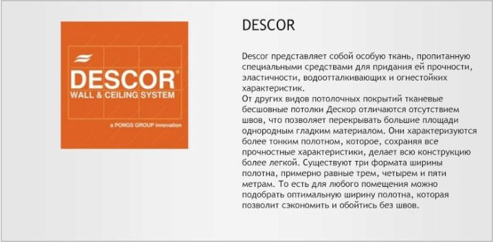 Една от основните характеристики на платна Descor е техният състав. Таваните са произведени в Германия на модерно оборудване чрез нанасяне на разтопен полиуретан върху здрава тъканна основа. След това основата се обработва с полиестер от двете страни. Резултатът е безшевни платове с европейско качество..