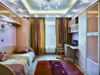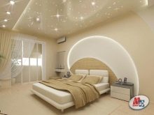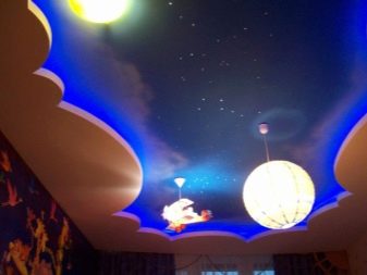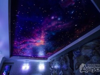 Огледалната повърхност на тавана не само придава на стаята луксозен вид, но и визуално разтяга пространството. Често се използва комбинация от филм с огледален ефект за горния слой и матовата тъкан за долния слой. Ако искате да използвате чертежа си на тавана, можете просто да го отпечатате. Ефектът на звездното небе се създава по различни начини: с помощта на LED лента или малки светодиоди, както и филм с готов небесен модел. В последния случай подсветката се осигурява от обикновена нощна светлина..