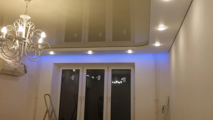 При монтиране на източници на осветление, на местата на специално монтирани пръти, е необходимо да се изгори дупка в платното (в никакъв случай не се прорязва). След това лампите се фиксират и мястото на закрепване се затваря със специални декоративни вложки. Когато инсталирате таванна рамка с LED ленти, не забравяйте да направите специален рафт за тях..