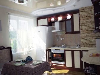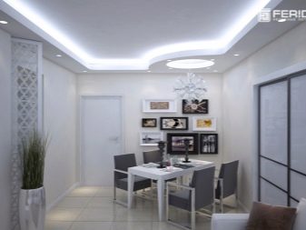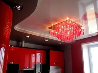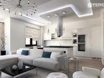 - Долното ниво на тавана визуално отделя домакинските уреди и зоната за готвене в кухнята от останалото пространство. Използва се полилей с необичайна форма, горното ниво с огледален ефект.