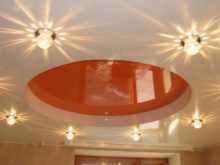 Можете също да използвате обикновен полилей за осветяване на стаята, но е за предпочитане да изберете нестандартни осветителни средства за красиви опънати тавани. Така оригиналността на дизайна ще бъде още по -очевидна..