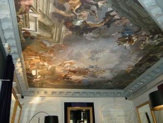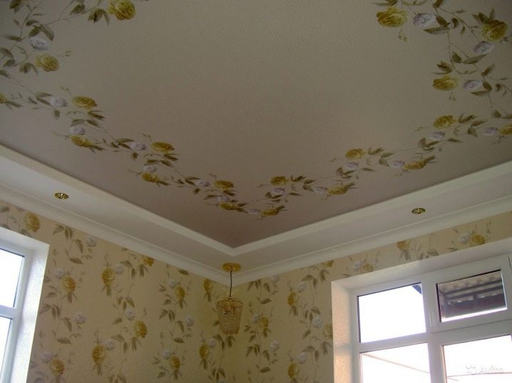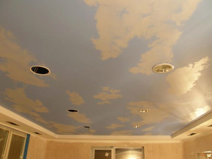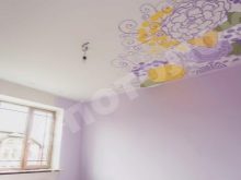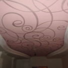 - Боядисването на тавана от плат е възможно с помощта на акрилни бои. Можете да създавате модели, да прилагате снимки и снимки, да променяте текстури. Средно едно платно може да бъде пребоядисано не повече от 5 пъти.