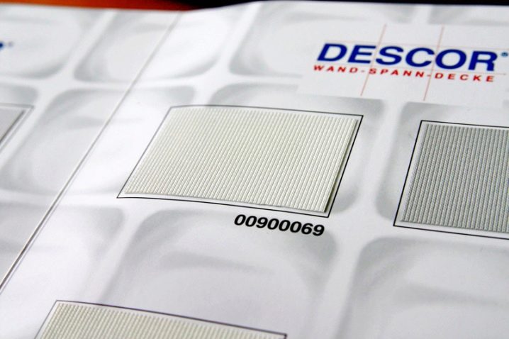 - Създават се най -качествените немски тавани от Pongs Textil (Descor). Материалът на тази компания е малко по -нисък по характеристики на този, предлаган от Швейцария, представена от Clipso. Материите на тази марка също са маркирани. Те са по -гладки в сравнение с първата компания. Марката предлага голям каталог от материали, в които има общи варианти и оригинални, например плат с малки пайети. Между другото, такива тъкани са евтини и това отчита високото качество.