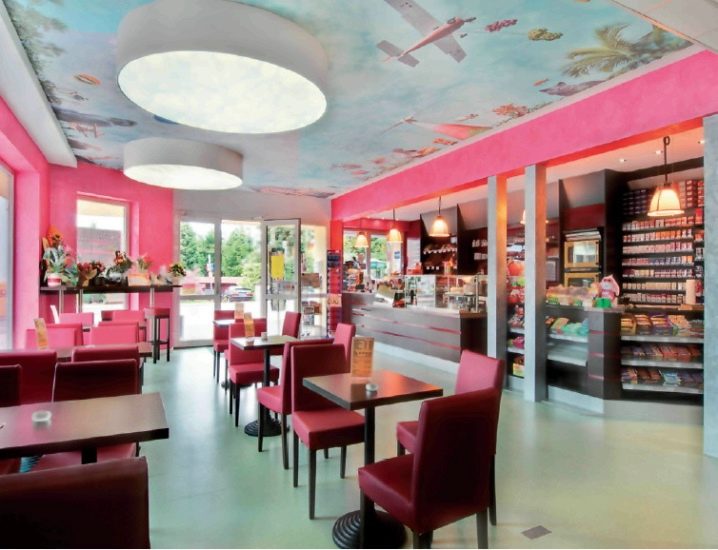 Тук можете ясно да видите как платните опънати тавани могат да се използват на обществени места, по -специално в кафене, а не само в апартамент или къща. Въпреки голямата площ, няма проблеми с тавана от плат. Удивително красиво платно, което е една част от композицията, поставя необходимите акценти в дизайна и разрежда цялостната атмосфера.