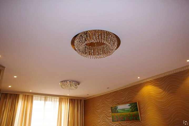 Що се отнася до платните опънати тавани, те имат по -широк диапазон на топлоустойчивост. В просторни стаи е по -добре да изберете опции с голям модел, в малки – обикновени светли платна, които визуално повдигат тавана и увеличават обема като цяло.