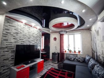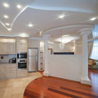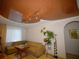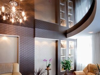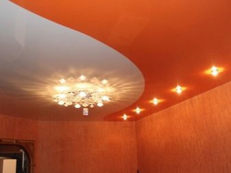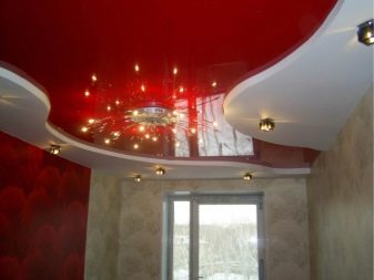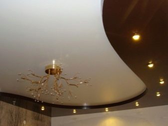 В случай на тавани на две нива, дизайнерите могат да използват различни видове платна. Контрастното приемане се постига чрез комбиниране на два цвята. Кръстовището може да стане граница на определена зона за визуално разделяне на помещението на места.