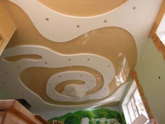 - Многостепенна. Моделите от този тип могат да изумят с оригиналността на своите форми. По правило това са най -редките и скъпи сортове. Някои композиции имат право да бъдат наречени съвременни произведения на изкуството. С помощта на такава композиция можете да превърнете в реалност най -смелите и необикновени дизайнерски идеи. По -добре е да инсталирате многостепенни тавани в просторни помещения. Идеален за просторни зали, спални и дневни.