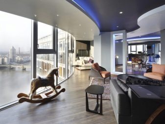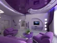 Не забравяйте да вземете предвид стила на интериора. Всяка декоративна посока има определени дизайнерски изисквания. Модерни висока технология гравитира към минимализма. Характеризира се с футуристични форми, неутрални тонове и хромирани елементи. Такъв опънат таван се допълва от малки LED лампи..