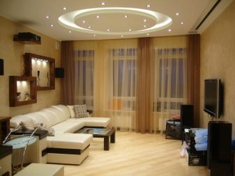 - “Таблетка”. В центъра на тавана е монтиран корпус от гипсокартон, оформен като таблет. По правило голям полилей е ключовият елемент на композицията. Останалата част от мястото е украсена със специална нишка или дебел филм. За да създадат триизмерен дизайн, дизайнерите използват техниката “кръг в кръг”, като инсталират по-малка конструкция върху голям обект.