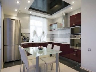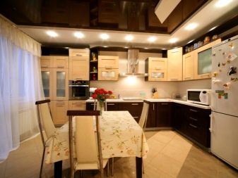 - Кухня. Това е много важна стая в къщата. В него те не само ядат, но и се отпускат и общуват със семейството и приятелите. Атмосферата на мястото трябва да бъде създадена удобна и благоприятна за разговор. Гланцовите платна са идеални. Играта на светлината на повърхността ще разшири границите на стаята.