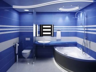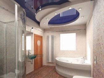 - Баня. Опънатите тавани в банята са рядкост, но е възможно. Платна в неутрални цветове (сиво, бежово и техните нюанси) върху основи от гипсокартон ще помогнат за заглушаване на контрастни комбинации в стаята. По -цветните и закачливи опции ще разредят еднаквата палитра от завършвания..