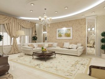 Опънат таван класически стил украсени с изразителни шарки и позлата. Бежовото и неговите нюанси се използват като основен цвят..