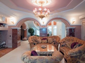- Хол. Обикновено холът или холът е най -голямата стая в къщата. В този случай дизайнът в идеалния случай ще се справи с ролята на акцент в интериора. Многостепенна рамка и комбинация от контрастни цветове е най-доброто решение за просторна стая с високи тавани. Допълнете композицията с осветителни тела. Това може да бъде луксозен полилей с висулки и позлата, или много миниатюрни прожектори..