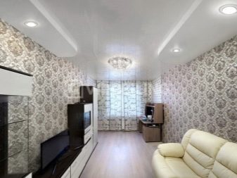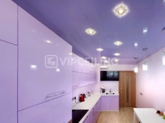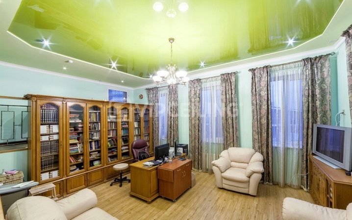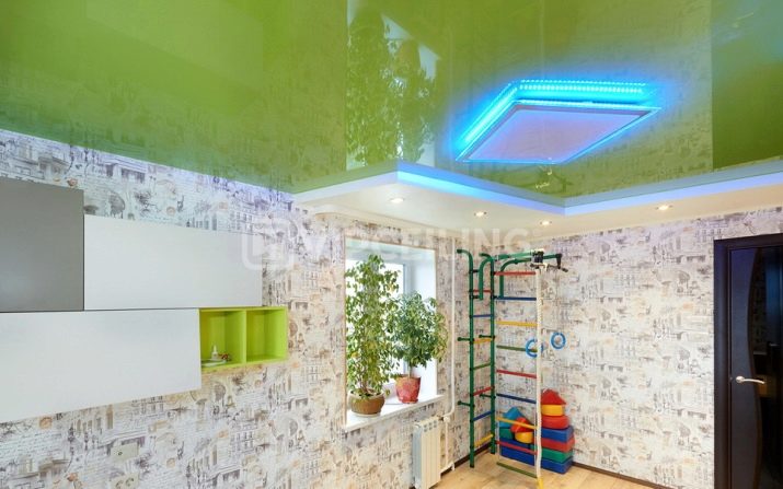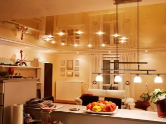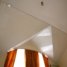Гланцови дизайни, на първо място, те спомагат за увеличаване на количеството светлина в стаята. Те отразяват до 96% от падащите върху тях светлинни лъчи. Въпреки това таванът не изглежда огледален, въпреки че силуетите на хора и предмети в неговото отражение ще бъдат леко различими. Поради това свойство на платното се появява ефектът от визуално увеличаване на стаята, което несъмнено е добро решение в интериорния дизайн на помещения с ниска височина. Цената на такъв рафт варира от 550 до 1300 рубли на квадратен метър..