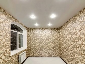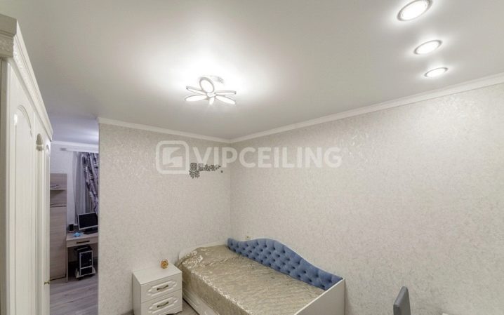 Мат таванът визуално прилича на обичайните измазани и замазки, но основното му предимство е идеално гладко платно. Ще бъде подходящ в класически или минималистичен дизайн, няма да се откроява ярко и да разсейва вниманието. Матовото платно е малко по -евтино от лъскавото: от 500 до 1200 рубли на квадратен метър.