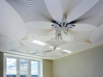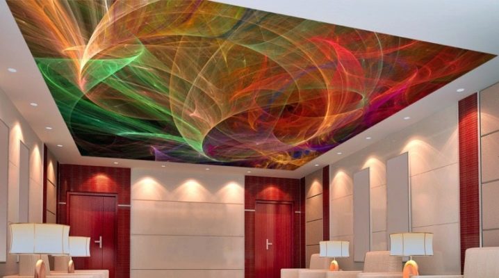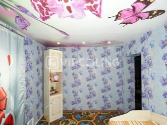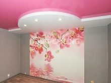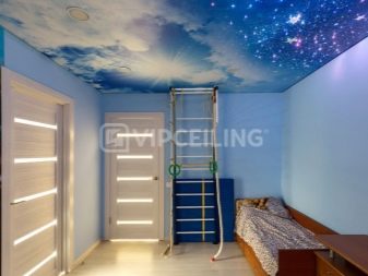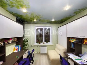 - В дизайна на стаята използват се и опънати тавани с фотопечат. Такива платна са ограничени по ширина – до 2 метра. Отпечатването може да се извърши както върху традиционна гланцирана повърхност, така и върху матово или сатенено. Изображението, което ще бъде приложено към структурата на опъване, можете да измислите сами или да изберете от предварително изготвен каталог с чертежи.