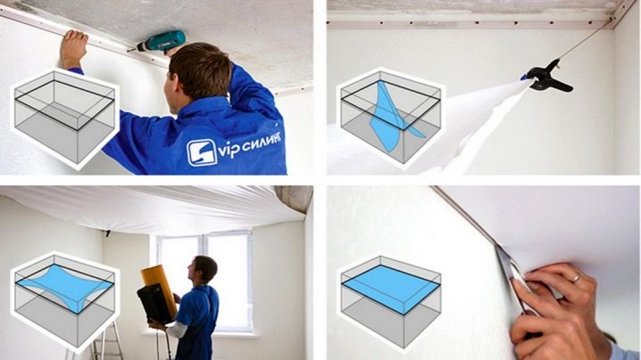 - При монтиране на поливинилхлориден филм стаята първо се нагрява до необходимата температура, при която материалът лесно се разтяга. На стените или тавана се монтират предварително монтажи, върху които след това се фиксира филмът.