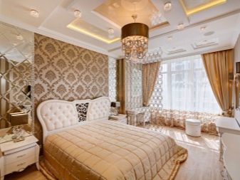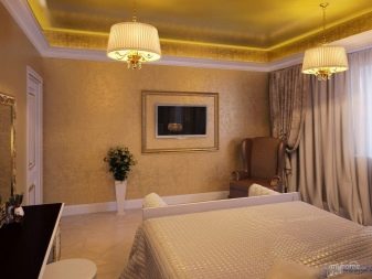За по -сложни ансамбли, опънатите тавани със златна повърхност са идеални. Такива платна изглеждат скъпи и елегантни. но препоръчително е да ги комбинирате с по -проста декорация на стени, в противен случай ансамбълът може да е твърде “тежък”.