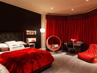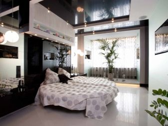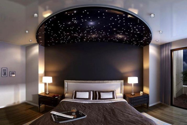 Черен опънат таван ще изглежда много смел в спалнята. Психолозите са скептични по отношение на подобно дизайнерско решение, като твърдят, че такъв тъмен цвят на тавана ще има изключително потискащ ефект върху собствениците.. Въпреки това, много хора все още се обръщат към този дизайн на спалнята, тъй като той отговаря на техния вкус..