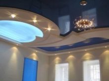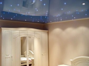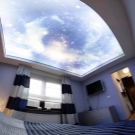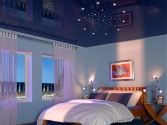 Гланциран тъмносин таван може да бъде позициониран в спалня с меки сини стени и син килим на пода. В такава стая лаконично дървено легло с малки дървени странични маси ще изглежда органично. Разпръскването на малки крушки, образуващи кръг, ще изглежда страхотно като осветление..