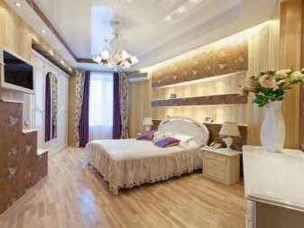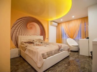 В спалнята можете да инсталирате не само прост, но и многостепенен таван. Подобни дизайнерски решения могат да трансформират интериора и да го направят по -органичен..