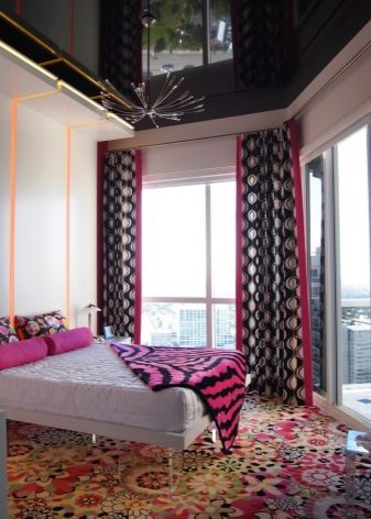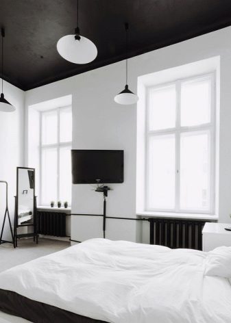 Ако сте решени да се обърнете към черен таван, тогава трябва да помислите, че те ще направят твърде малка стая дори тясна. Освен това останалите детайли в интериора не трябва да са толкова тъмни, в противен случай пространството просто ще се слее в едно черно петно..