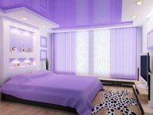 Цветни тавански покрития могат да се монтират в спалнята.. Сините, зелените, бледосините и розовите платна са най -подходящи за това.. Наситените червени, портокали, лилави и жълти цветове възбуждат човешката нервна система, затова е по -добре да откажете такива бои в декорацията на спалнята – те ще пречат на бързото заспиване и здравословния сън.