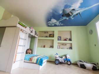 В спалнята на малко момче, таваните с изображения на коли и карикатури ще изглеждат хармонично. Плътните цветове също са приемливи. Сините, зелените и сините цветове са подходящи за момчешката стая..