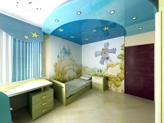 - При проектирането на детската стая е необходимо да се вземе предвид възможността за повреда на платното. Ако такива дефекти се появят на тавана, те могат да бъдат затворени с прожектори..