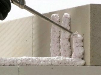- На бетонни блокове с дебелина не повече от 115 мм пяната се нанася в една лента в центъра. Ако дебелината на стените е по-голяма, тогава е необходимо да се приложат две успоредни ивици, отстъпващи от ръбовете на 3-5 см. Подобни изисквания се прилагат и за използването на пяна в тухлена зидария.