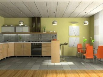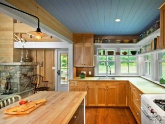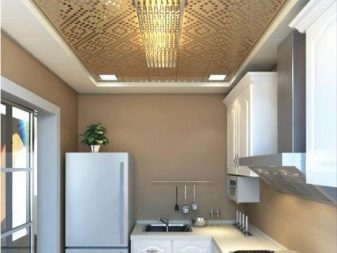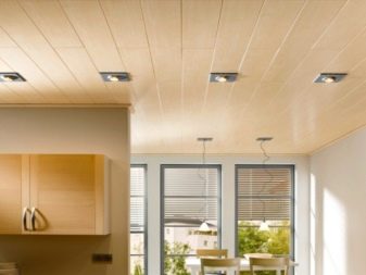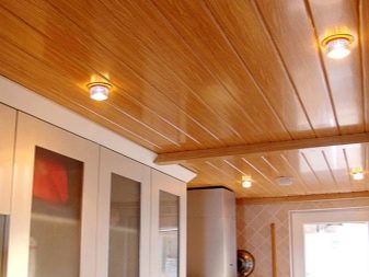 За украса на тавана на кухнята са подходящи ламелни панели. Те приличат на хастар и ако изберете цветовете на дърво, естествен камък или цветя, се създава атмосферата на природата и топла и уютна атмосфера. В допълнение към плътен цвят или шарки, се прилага комбинация от различни цветове.