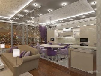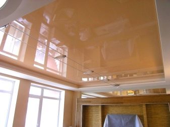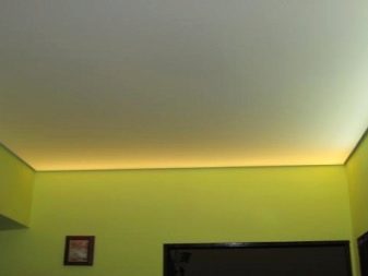 За осветление се използват ярки крушки. Ако трябва да подчертаете зоната, например в хола, тогава полилей трябва да бъде поставен в центъра на тавана. Ако има цветна подсветка, тя ще изглежда страхотно на фона на лъскава равнина..
