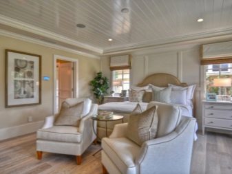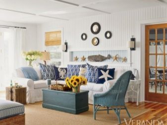 Доминиращите тонове на стила са синьо и бяло. Тази комбинация е идеална за декориране на детска стая, спалня, хол. За пластмасов таван можете да комбинирате два цвята на морска тема и да допълвате с осветление, полилей. Обикновените мебели ще ви помогнат. Ако имате бои и желание да създавате, тогава можете да нарисувате морски мотиви на стол или маса. За да се потопите в дълбоката морска стихия, трябва да поставите декоративни мачти, вази с пясък и миди, фигурки със силуети на морски обитатели.
