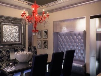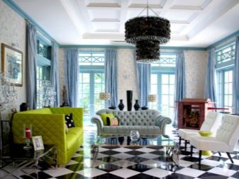 Основните декоративни елементи, които са поразителни, са искри, гланц, козина, кадифе, благородни метали. Стилът се характеризира преди всичко с контрасти и скъпо изглеждащи материали. Ако не спазвате мярката в цветовата схема и броя на аксесоарите, тогава апартаментът ще се претовари. Вместо да се възхищавате на интериора, ще ви се струва, че в стаята се случва хаос. Най -добрият вариант за таван би бил бял, златен или сребърен с черни линии и вдлъбнати светлини. Мебелите трябва да са със същите цветове.