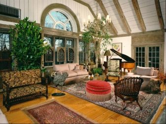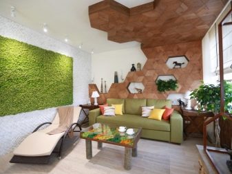 Този стил се характеризира със спокойствие и спокойствие. Основните цветове са зелено и бяло. Дървесната структура и основните тонове ще бъдат перфектно съчетани. Такива елементи могат да се прилагат във всеки сектор: на тавана или стените. Основният атрибут в стаята са живите растения..