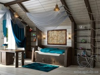 Това е смесица от Изток и Африка, чийто вид прилича на пътешественица. Таванът може да бъде украсен с цвят на тъмно дърво. Стените в естествени тонове ще изглеждат страхотно в цялостната цветова палитра на стаята. Мебелите са с богати нюанси на кафяво. Географски карти на стената, различни камъчета във вази, компас, маски действат като аксесоари..
